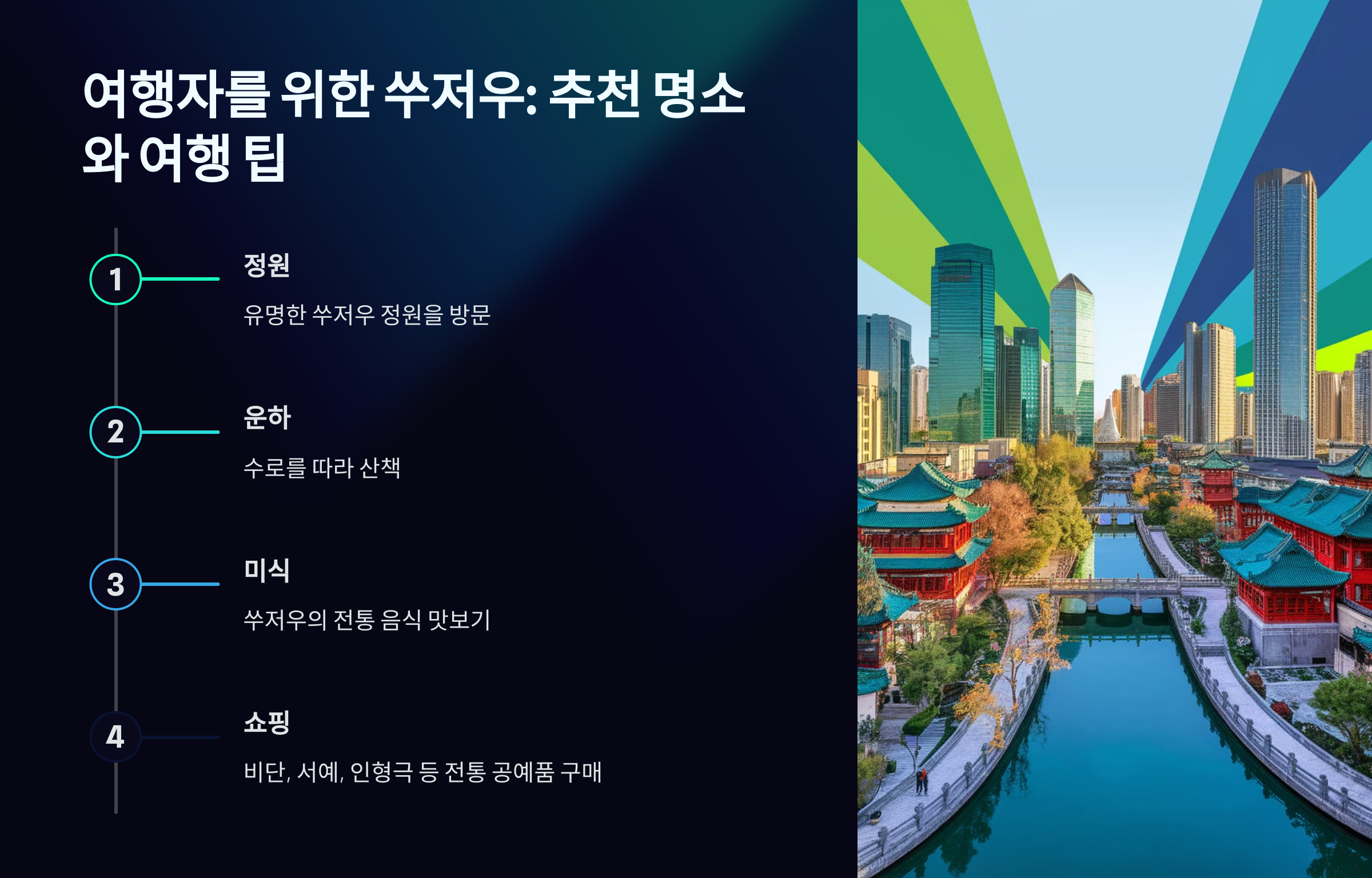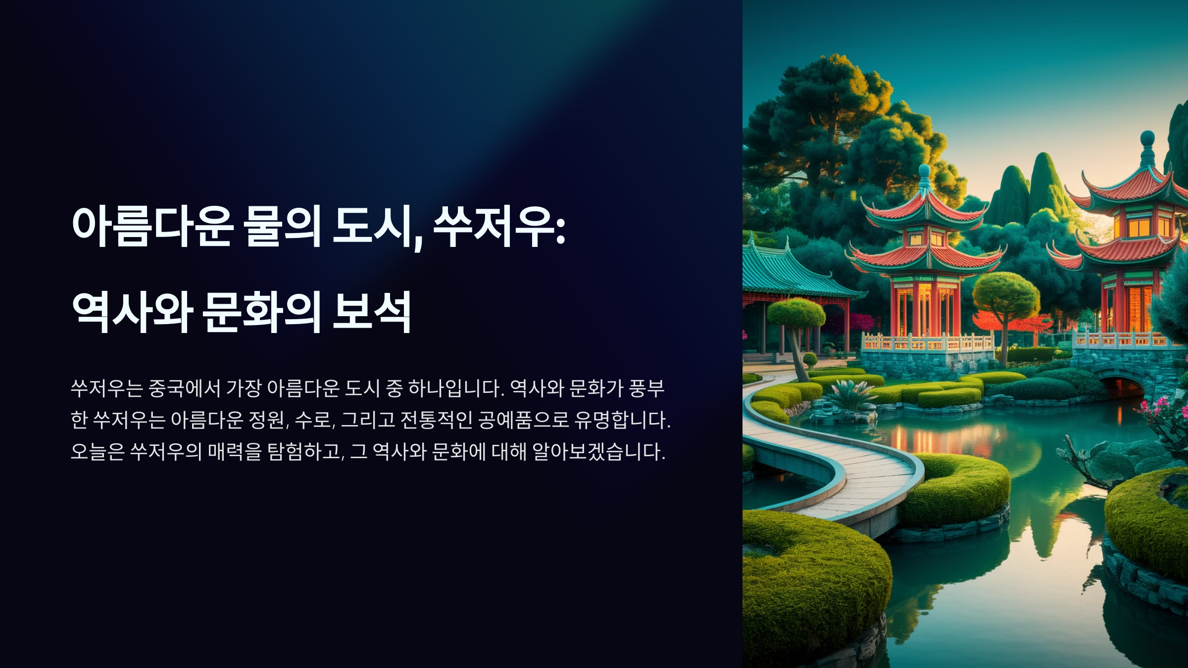 지금부터 쑤저우의 매력적인 역사, 아름다운 정원, 전통 문화, 그리고 맛있는 음식까지 자세히 알아볼게요! 🏯🌿