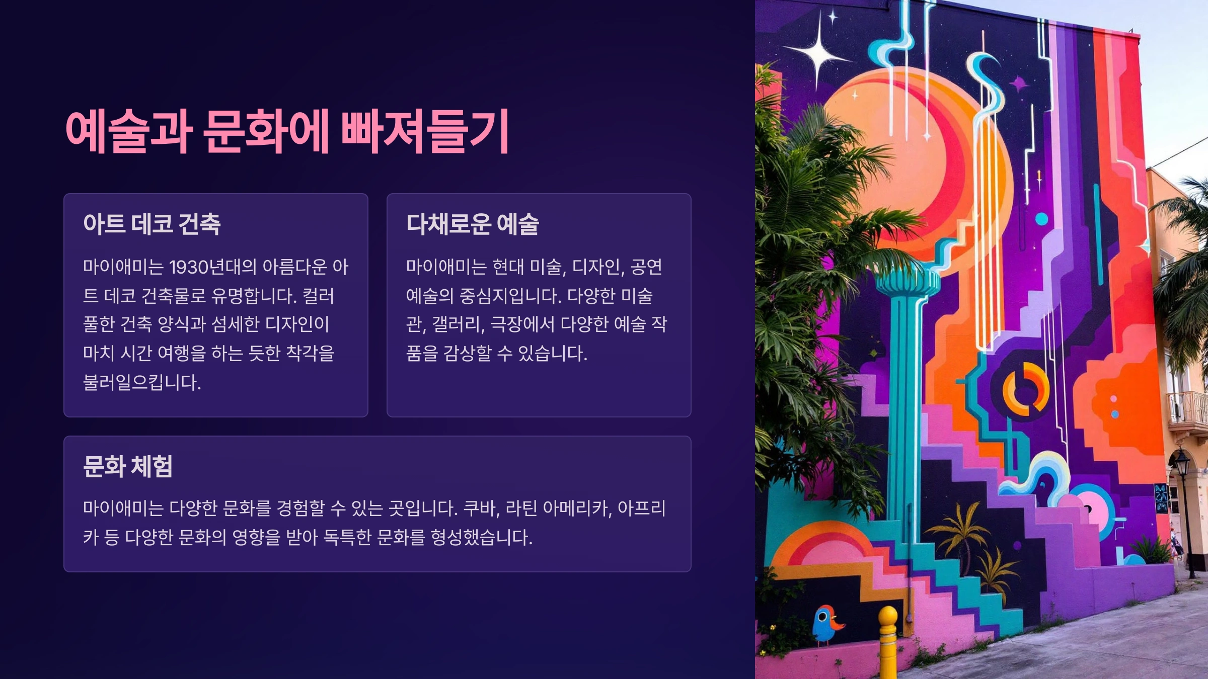 이 가이드는 마이애미에서 꼭 가봐야 할 장소들을 중심으로 준비했어요. 역사적인 배경부터 현지 미식 탐방, 숨겨진 쇼핑 명소까지 모든 것을 한눈에 볼 수 있도록 구성했답니다. 도시 곳곳의 매력을 한껏 느끼며 잊지 못할 여행을 계획해 보세요!