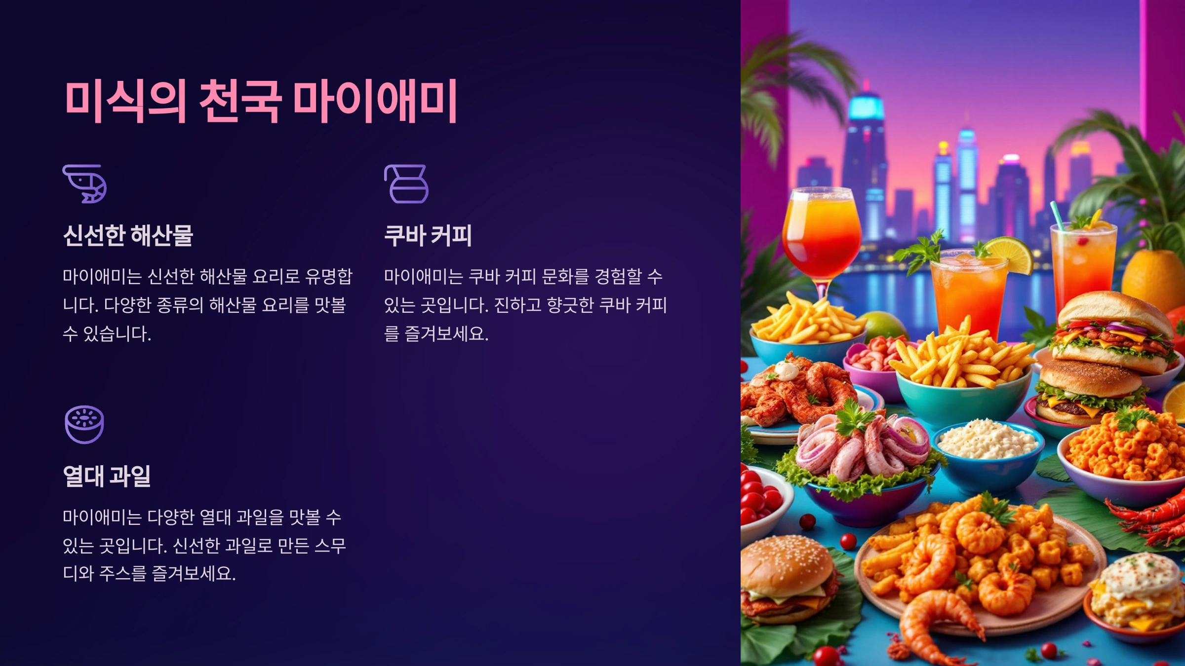 마이애미는 전 세계의 맛을 한자리에서 느낄 수 있는 곳이에요. 다양한 문화가 녹아든 음식들은 여행자들에게 특별한 미식 경험을 선사한답니다. 특히 마이애미는 라틴 아메리카와 카리브해 요리로 유명한데, 이를 현지 스타일로 재해석한 요리들이 많은 사랑을 받고 있어요.